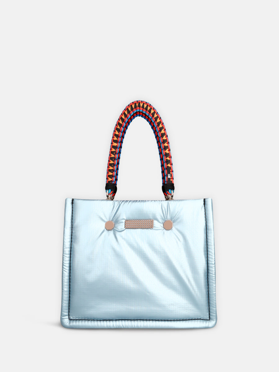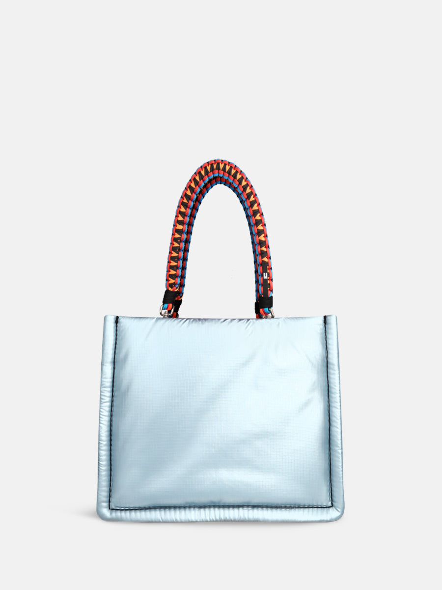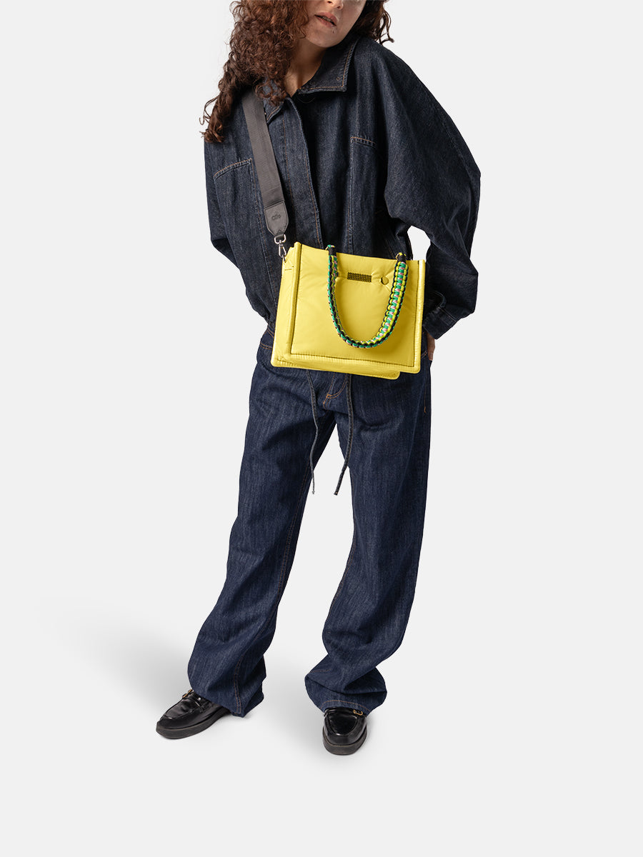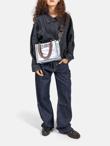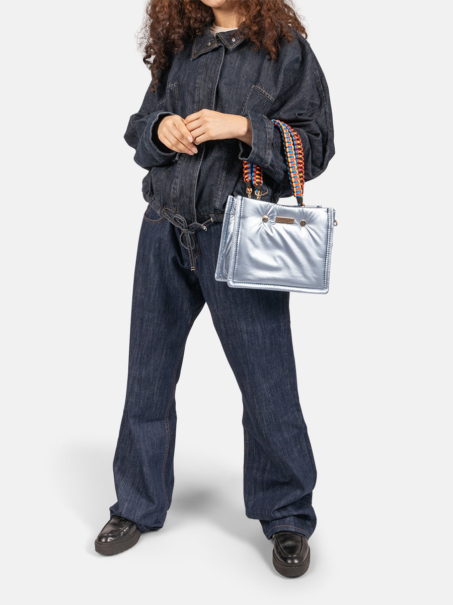 Inside, the bag features a spacious compartment, two smaller pockets for your phone and keys, and a zipped pocket for keeping all your secrets safe. The MINI FLEX comes with a black adjustable nylon strap and two removable colourful braided handles, allowing you to wear it crossbody, over the shoulder, or carry it by the smaller handles.