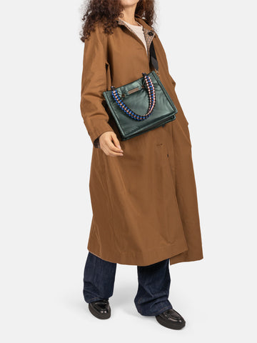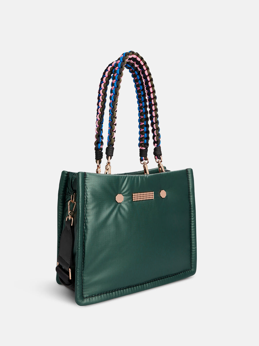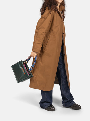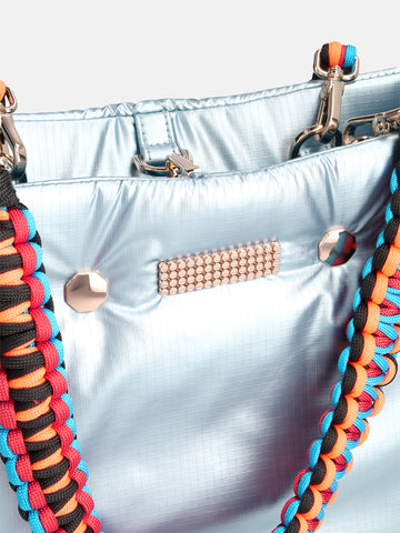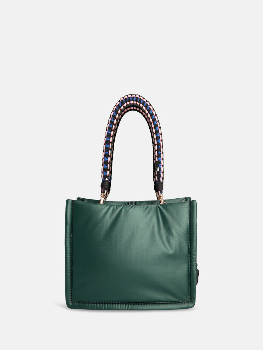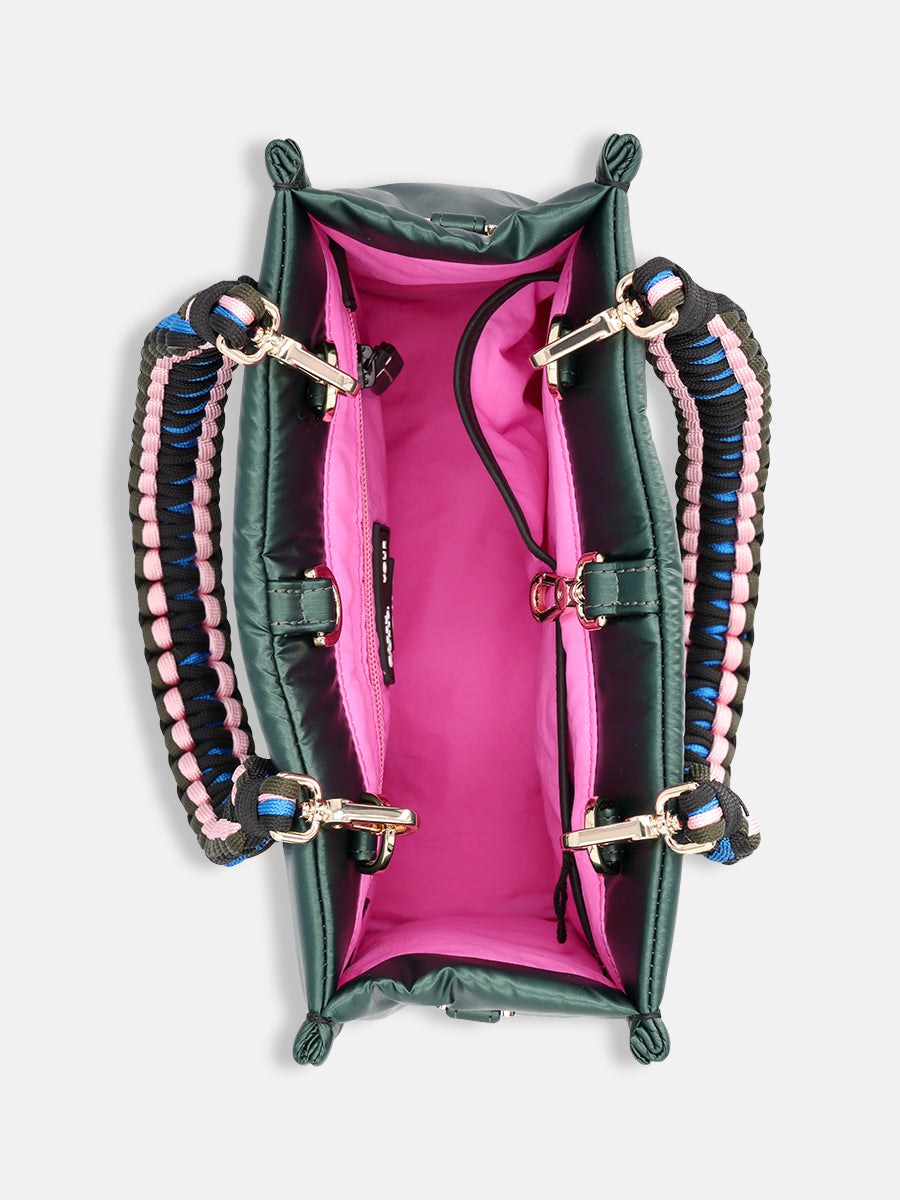 Inside, the bag features a spacious compartment, two smaller pockets for your phone and keys, and a zipped pocket for keeping all your secrets safe. The MINI FLEX comes with a black adjustable nylon strap and two removable colourful braided handles, allowing you to wear it crossbody, over the shoulder, or carry it by the smaller handles.