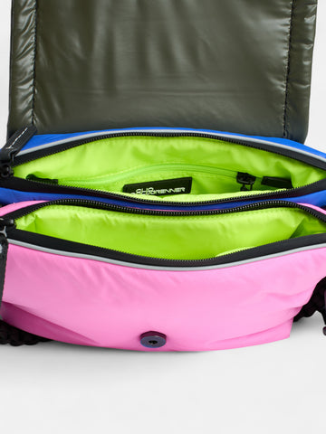 Its striking color contrasts bring a graphic, playful twist to a sleek and functional silhouette. Wear it crossbody with the wide, adjustable strap for everyday ease, or switch to the braided strap for an extra dose of personality.